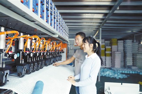 图为10月18日,朱高伟夫妻俩在扶贫车间查看机器运行情况。
