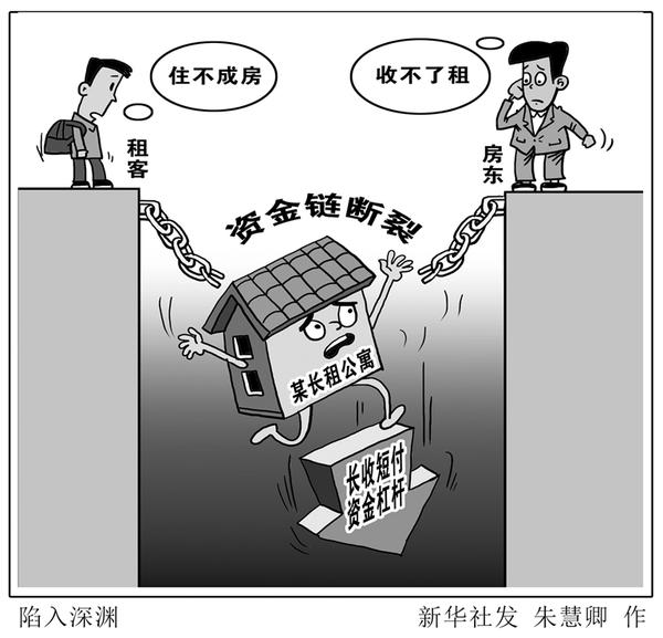 近期,多家品牌长租公寓运营商资金链断裂,停止运营,给众多租客、房东带来经济损失。“新华视点”记者调查发现,长租市场欠缺准入门槛、标准规范,不少企业向租客按年收租金、按季或按月付给房东,利用长收短付资金杠杆能放大到10倍以上。一旦资本市场出现调整,这类企业往往就陷入资金链断裂深渊。新华社发 朱慧卿 作