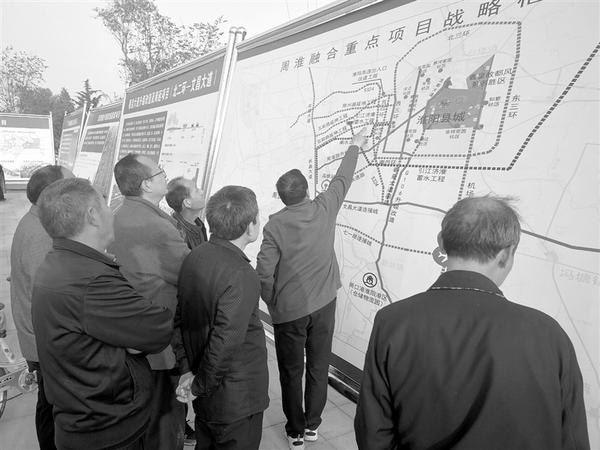 11月11日,市民在淮阳苏子读书园内的周淮融合重点项目战略框架图展板前热议周口未来发展。几天前,“九河共治”、城区园林绿化、南水北调及引江济淮、周淮路升级改造、羲皇大道升级改造及南延等项目巨幅展板出现在淮阳苏子读书园内,引起市民高度关注。记者 刘俊涛 摄