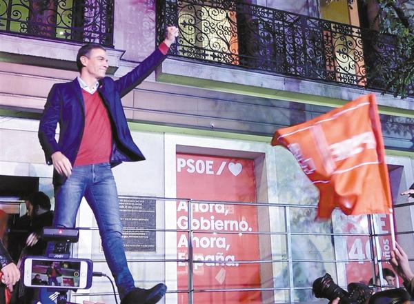 11月10日,在西班牙马德里,中左翼政党工人社会党候选人、西班牙看守政府首相佩德罗·桑切斯庆祝胜利。