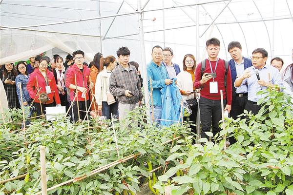 11月14日,河南农大马长生老师(右)为参观者讲解新品种的特性。河南农大扶沟蔬菜研究院被认定为周口市扶贫企业后,新建26个展示大棚,种植新品种1400多个。贫困群众利用闲暇时间到展示大棚考察新品种、学习新技术等,扶贫基地成了群众脱贫的大课堂。