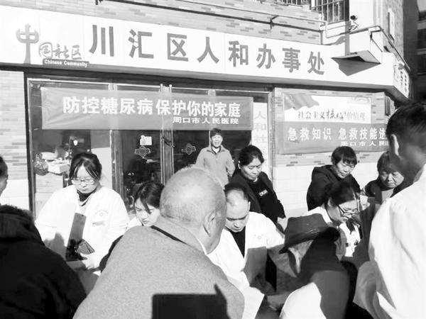 11月14日是“联合国糖尿病日”,川汇区卫健委组织辖区医疗机构开展形式多样的活动,宣传糖尿病防治知识,普及健康生活理念,推广科学的营养学知识。图为周口市人民医院在人和社区开展主题义诊活动。 记者 韩志刚 通讯员 王君 摄