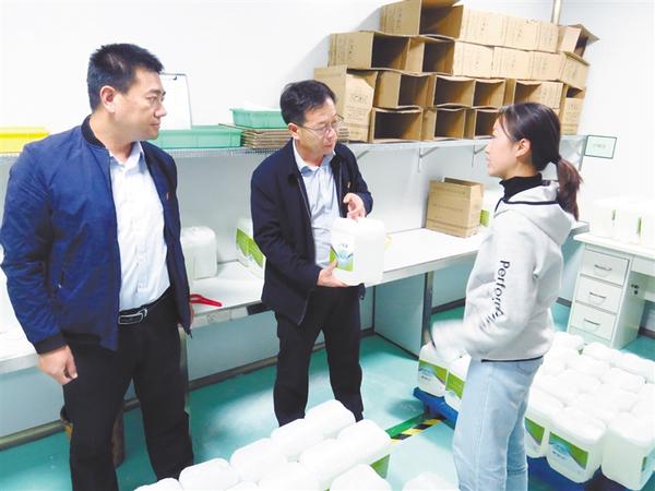 郸城县城郊乡积极优化发展环境,发挥统战优势,实施“凤还巢”工程,为创业者提供全方位、全过程的服务,切实做到服务在一线、问题解决在一线。图为城郊乡党委书记王忠(左二)在返乡创业人士创办的河南清道夫生物科技有限公司了解企业运行情况。
