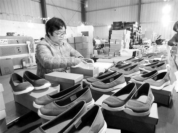 11月20日,在沈丘县付井镇某鞋业加工车间,生产流水线上的工人在忙着加工、包装订单鞋。