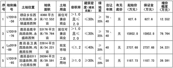 挂牌报价时间为:LY2018-56地块:2019年12月13日9时至2019年12月23日15时。LY2019-101地块:2019年12月13日9时至2019年12月23日15时10分。LY2019-76地块:2019年12月13日9时至2019年12月23日15时20分。LY2019-89地块:2019年12月13日9时至2019年12月23日15时30分。LY2019-95地块:2019年12月13日9时至2019年12月23日15时40分。挂牌网址:鹿邑县公共资源交易平台(http://www.lyggzyjy.org.cn/)。