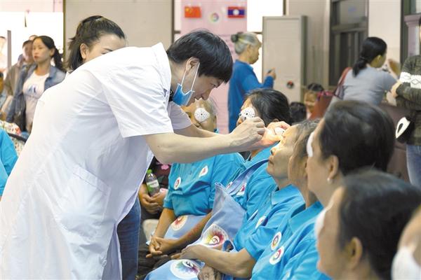 11月25日,在老挝万象,医疗队成员为接受白内障手术的患者复查。