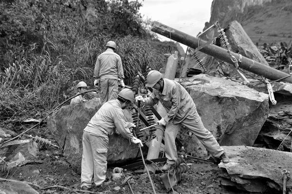 在广西崇左市大新县中信大锰大新锰矿分公司大锰矿区,工作人员抢修因地震受损的电力设备(11月25日摄)。