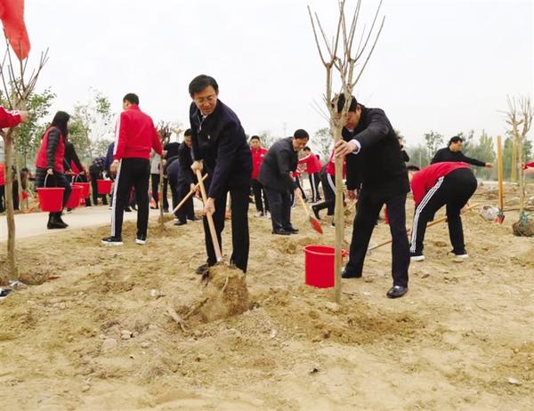 在植树现场,县四个班子领导与参加义务植树活动的干部职工、志愿者们一起挥锨铲土、植树播绿,有的扶苗固根,有的挥锹填土,有的踩紧压实,分工合作,齐心协力,呈现出一派热闹非凡的劳动景象。大家采取“深坑深栽高封土,三埋两踩一提苗”的栽植方法,突击大干。经过辛勤劳动,1300多棵新栽植的树苗迎风而立,形成一道生机盎然的风景。