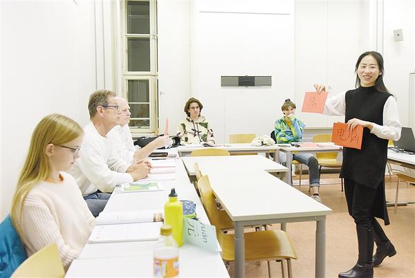 11月28日,奥地利维也纳大学孔子学院中文老师史佳妮(右)带领学生们学习中文。维也纳大学孔子学院是奥地利境内规模最大的孔子学院,近年来不少维也纳当地居民前来学习汉语和了解中国文化。据介绍,本学年200余人在维也纳大学孔子学院学习,学生年龄跨度从十几岁到七十多岁。新华社记者 郭晨 摄