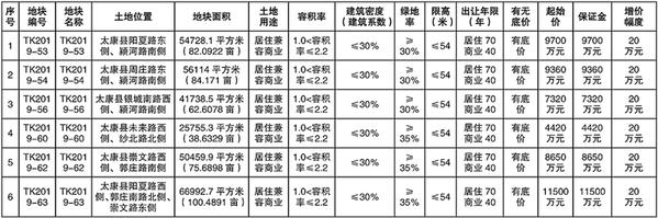 备注:TK2019-53号、TK2019-54号、TK2019-56号宗地:作为太康县滨湖花园棚户区改造建设项目用地,地上所建房屋住宅部分不得对外销售,安置房项目的规划、建设和分配由县住房和城乡建设局负责监管。根据河南省国土资源厅办公室《关于建立土地利用动态巡查制度加强建设用地供后开发利用全程监管的通知》(豫国土资办发〔2013〕68号),TK2019-60号、TK2019-62号、TK2019-63号竞买人(单位)竞得土地后,须签订《土地出让合同履约保证协议书》,在签订《国有建设用地使用权出让合同》之前,按照成交价款的5%缴纳履约保证金。