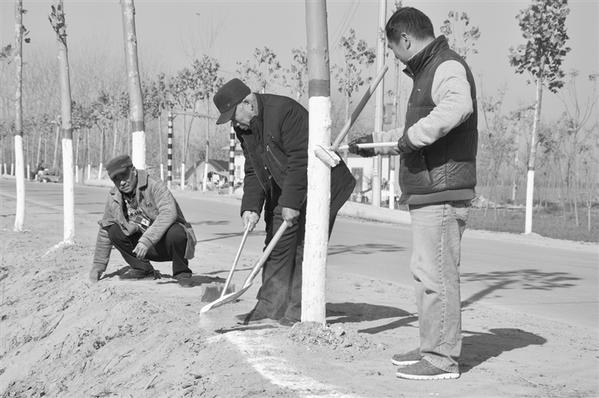 为建设美丽宜居乡村,商水县黄寨镇对主要道路进行统一治理,对路肩进行培土覆盖,对沿线树木和建筑物外墙涂白粉刷,美化环境,改善群众出行条件。图为12月4日该镇村民在培护路肩。记者 付永奇 摄