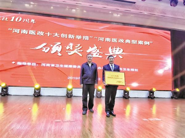 11月29日上午,2019年河南省深化医改经验推广会暨医药卫生体制改革高峰论坛在省会郑州举行。郸城县卫健委以排名第一的成绩荣获“河南医改十大创新举措”奖。省卫健委副主任张若石为郸城县卫健委党组书记、主任付登霄颁奖。颁奖典礼上,付登霄以《强化专科引领 提升服务效能 打造高质量紧密型医疗健康服务共同体——河南省郸城县医共体建设探索之路》为题,作专场经验分享报告。②8