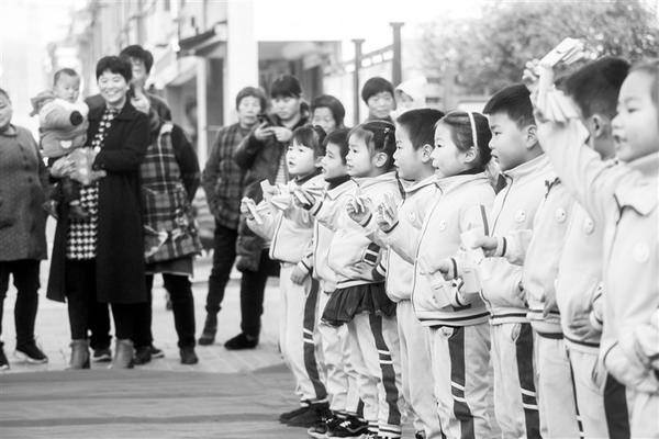 12月4日,夹浦镇中心幼儿园的孩子们在鼎甲桥村文化礼堂前用唱快板的形式给村民们进行法制宣传。