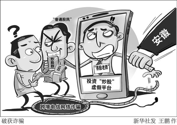 境外操控炒股群,团伙分工角色扮演,撺掇股民在假平台投资“炒股”,受害者遍及全国29省份。记者日前从安徽省马鞍山市公安局了解到,当地成功捣毁这一特大跨境电信网络诈骗团伙,抓获犯罪嫌疑人14名。新华社发 王鹏 作