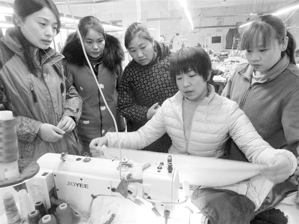 12月9日,商水县巴村镇巴北村返乡农民工、县人大代表郭梅花指导留守妇女和贫困户制衣技术。郭梅花在镇人大帮助下创办了华宸服装有限公司,安排60名留守妇女和20名贫困人员就业,人均月工资3000多元。