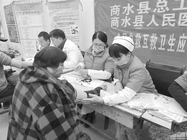 为助力脱贫攻坚,近日,商水县人民医院组织医务人员走进固墙镇黄台村开展义诊活动。此次活动共义诊110余人、发放价值2000余元的药品,受到该村群众的一致好评。图为医护人员为群众测量血压。