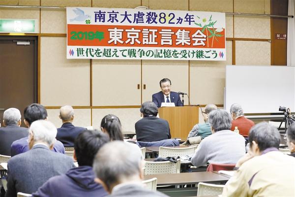 12月11日,在日本东京,南京大屠杀幸存者葛道荣之子葛凤瑾在南京大屠杀东京证言集会现场代替父亲前来证言。为悼念南京大屠杀死难者并揭露侵华日军残忍罪行,由日本南京东京证言集会执行委员会主办的“南京大屠杀82年 2019东京证言集会”11日晚在东京举行。集会呼吁日中两国人民不忘历史,共创和平友好未来。新华社发
