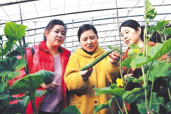 12月13日,周口职业技术学院的两名教师(右一右二)在大棚内解答菜农提出的黄瓜弯瓜和叶片下垂问题。该院鼓励青年教师带领学生(学员)走进实训基地,用书本知识帮群众解难答疑,用实践弥补书本的不足,通过实训结合、学教结合,提高师生解决实际问题的能力。谷志方 摄