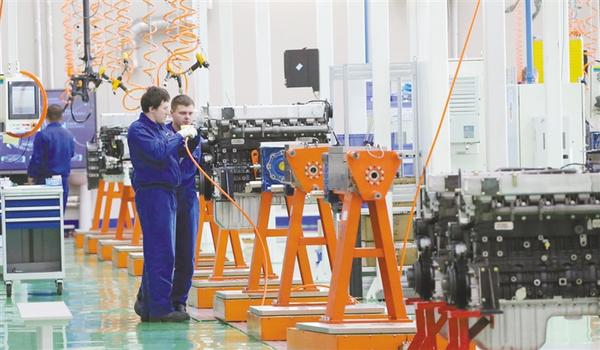 图④ 2019年10月14日,在白俄罗斯明斯克机场附近的中白工业园内,两名白方员工组装柴油发动机。当日,中国潍柴集团与白俄罗斯马兹集团合资建设的发动机生产厂正式投产,开始批量生产柴油发动机。本栏文图均据新华社电