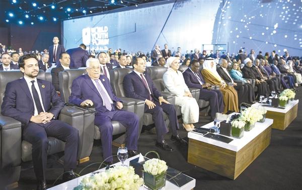 12月14日,在埃及沙姆沙伊赫,埃及总统塞西(左三)、巴勒斯坦总统阿巴斯(左二)等出席世界青年论坛开幕式。第三届世界青年论坛14日晚在埃及红海海滨城市沙姆沙伊赫开幕,来自多个国家和地区的7000余名青年代表参加论坛。本届论坛将持续至17日。论坛主题为和平、发展和创新,各国青年还将就食品安全、环境和气候、人工智能等议题展开讨论。新华社记者 李碧念 摄