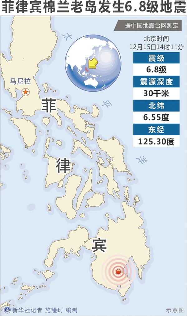 新华社马尼拉12月15日电(记者 袁梦晨 郑昕)菲律宾南部棉兰老岛15日下午发生6.9级地震,目前暂无人员伤亡报告。