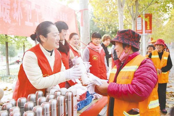 图①近日,项城市新时代文明实践中心组织骄阳爱心公益团队的志愿者,到驸马沟生态公园开展“关爱环卫工、寒冬送温暖”活动,为环卫工人送去保温杯、手套、口罩、扫帚、挂历等物品,帮助环卫工人清理落叶,为“城市美容师”送上寒冬里的温暖。