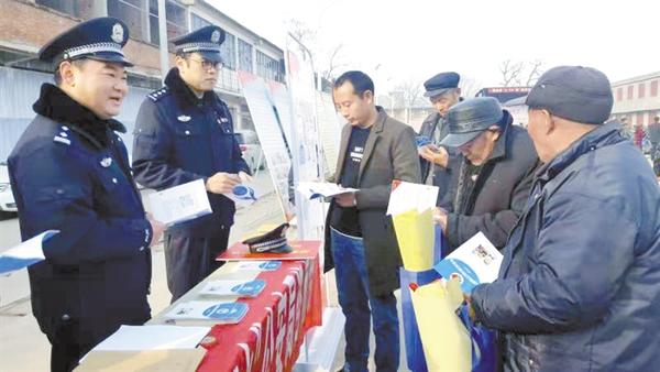 12月20日,县公安局组织民警深入乡村开展送平安、送防范、送安全“三下乡”活动。民警利用真实鲜活的事例向广大群众普及了禁毒、反暴恐、防诈骗等知识,为群众送去了一道丰盛的“法律大餐”。图为邓城派出所民警在国家AAA级旅游景区叶氏庄园诚信广场开展宣传活动。 记者 付永奇 通讯员 郭利军 摄