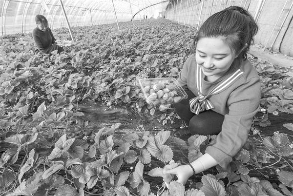 12月23日,在河北省武强县聚宝种植专业合作社的大棚里,两位女士在采摘草莓。 近年来,河北省武强县大力发展反季蔬菜、水果种植和乡村旅游业,吸引了众多游客市民前来观光和采摘。新华社发