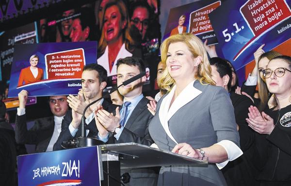 12月22日,在克罗地亚萨格勒布,克罗地亚总统选举候选人、现任总统基塔罗维奇(前)庆祝进入第二轮投票。