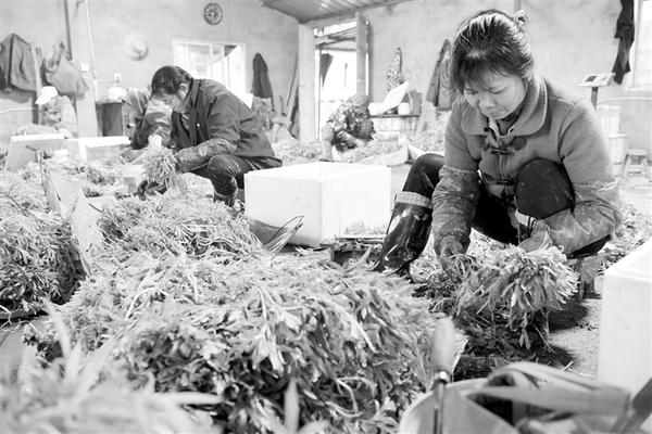 江西南昌:藜蒿产业富农家 12月24日,在南昌县幽兰镇竹林村藜蒿种植合作社内,当地农户在分拣刚收割的藜蒿准备装箱外销。近年来,江西省南昌市南昌县幽兰镇大力发展具有地域特色的藜蒿产业,先后建立10余个藜蒿种植基地,种植规模达到6000亩。此外,藜蒿种植基地还以合作社的形式为村民提供劳动岗位,带动贫困户增收。新华社记者 彭昭之 摄