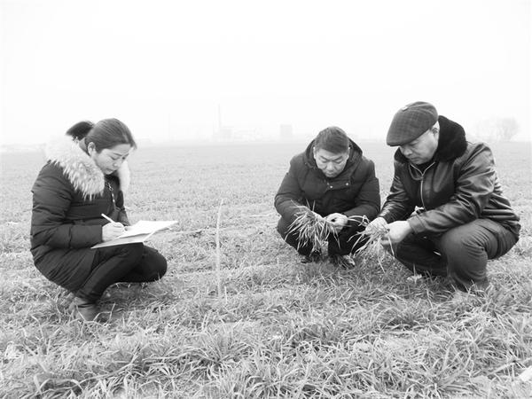 12月24日,沈丘县农技推广服务中心的农技人员在周营镇欧营村一个万亩小麦高产示范方内,认真查看当前小麦墒情、虫情、分蘖数等。