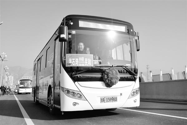 2019年12月31日,公交车辆通过川海大桥。当日,连接甘肃、青海两省的川海大桥正式通车运营。川海大桥位于甘肃省兰州市红古区与青海省海东市民和回族土族自治县交界处的湟水河上,全长1656米、宽31米,按照二级公路标准建设,为双向六车道,全线设计行车速度每小时40公里。新华社记者 张龙 摄
