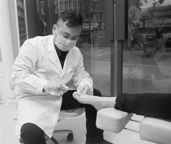 初见张燕飞,他正在为客户修脚,只见他手里的修脚片刀一层一层“片”下死皮(如图)……熟练的手法让顾客赞不绝口。