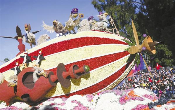②1月1日,在美国洛杉矶帕萨迪纳市,一辆花车参加游行。