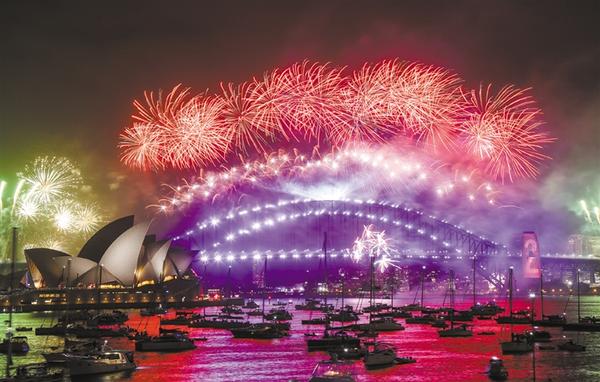 ①2020年1月1日,澳大利亚悉尼歌剧院和海港大桥畔燃放烟花,庆祝新年的到来。