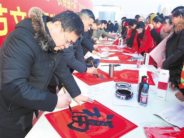 春节即将来临,周口经济开发区党委、管委会联合市文联、市书协举行万副春联大赠送活动。日前,我市著名书法家王猛仁、李珂、李为、游富华、薛永信、何祥峰、轩敬贤、朱金辉等来到开发区广场,不畏严寒,挥毫泼墨,为广大群众义务书写春联。