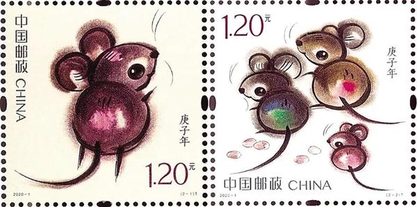 庚子鼠年生肖邮票第一图名为“子鼠开天”,取自民间传说“鼠咬天开”,萌动之鼠腾空跃起,咬破混沌,遂成宇宙,寓意国家取得了开天辟地、继往开来的巨大成就;第二图为“鼠兆丰年”,三只小鼠一副欢喜自得模样,寓意阖家欢乐,花生图案一派丰收景象,寓意2020年五谷丰登、阖家欢乐。画面运用装饰小写意的画法,结合传统国画的渲染技艺,展现了生肖鼠的可爱萌动,预示着伟大祖国的繁荣富强。
