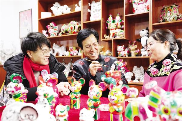 1月7日,泥塑(凤翔泥塑)国家级代表性传承人胡新明(中)与两名民间艺人交流泥塑制作技艺。
