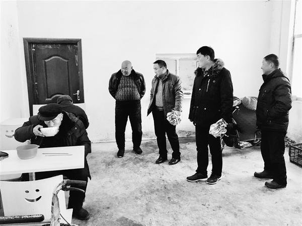 大雪飘飘,岁寒情深。1月7日上午,扶沟县江村镇组织镇、村干部,顶风踏雪前往敬老院和困难群众家中走访慰问,排查了解住房安全、饮食起居等情况,并为敬老院老人和困难群众送去棉被和米面油等慰问品,确保他们安全度冬、温暖过年。图为镇、村干部在敬老院看望老人。