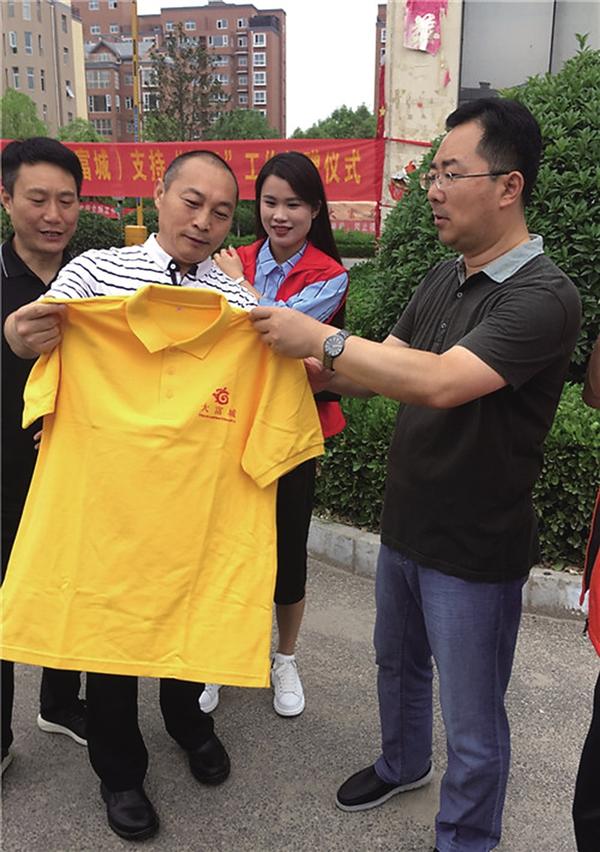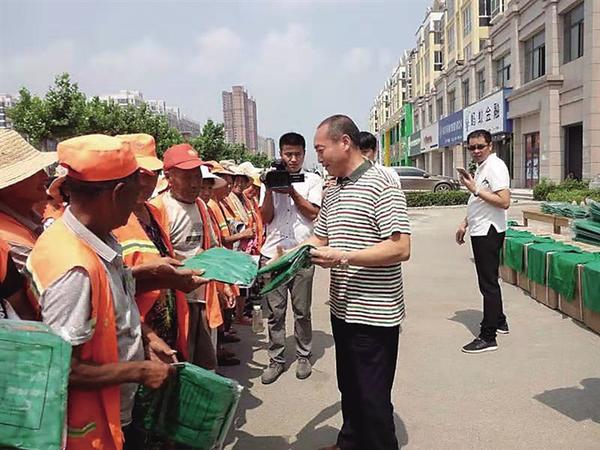 2019年7月4日一大早,在西华县“大富城”门前,百名环卫工人领到方凯再次捐赠的T恤衫。这天,方凯又向全县850名环卫工捐赠价值13.5万元的T恤衫850件。他连续几年坚持为西华县环卫工人捐赠T恤衫和防寒服6000余件,价值216万余元。
