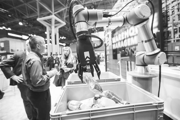 1月12日,在美国纽约的全国零售商联合会年度大会上,人们参观自动分拣货物的机械手。