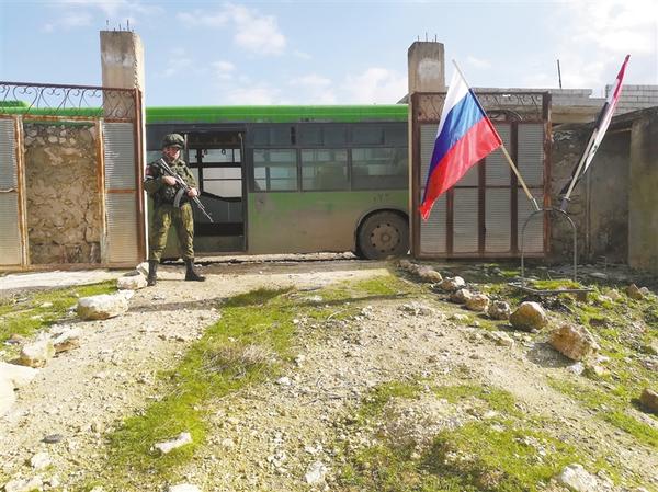 1月13日,一名士兵站在叙利亚阿勒颇省西南部的哈迪尔地区开启的人道走廊处。 据叙利亚通讯社13日报道,叙政府在西北部伊德利卜省、阿勒颇省开启3条人道走廊,接待愿意从反对派武装控制区撤至政府军控制区的平民。