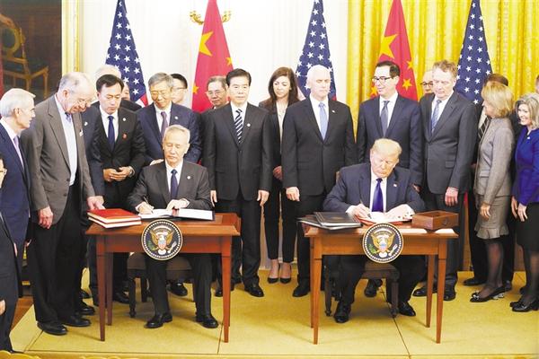 新华社华盛顿1月15日电(记者周效政 孙丁 刘晨)当地时间1月15日,美国总统特朗普在白宫椭圆形办公室会见中共中央政治局委员、国务院副总理、中美全面经济对话中方牵头人刘鹤,双方共同出席中美第一阶段经贸协议签署仪式。