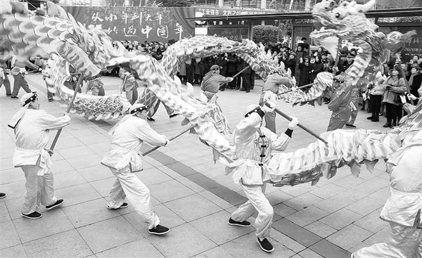 1月17日,演员在绵竹年画节上进行舞龙表演。当日,以“从小年到大年,到绵竹过中国年”为主题的第十九届绵竹年画节拉开帷幕。年画节上演出了以经典绵竹年画为原型排编的节目,如“骑车仕女”“老鼠嫁女”“迎春图”等;并举行威风锣鼓、狮灯龙灯、五福献瑞、春官赐福等传统民俗活动,为绵竹街头增添节日的喜庆氛围。新华社记者 江宏景 摄