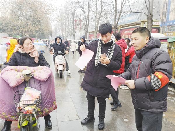 为保障中心城区空气质量,确保广大市民过一个安乐、祥和、幸福、洁净的春节,连日来,川汇区陈州街道办事处积极行动、主动作为,严格按照上级要求,多措并举做好烟花爆竹禁燃禁放工作,取得了良好效果。图为该街道办事处工作人员正在向过往群众发放宣传资料。 记者 张廉明 通讯员 史路路 摄