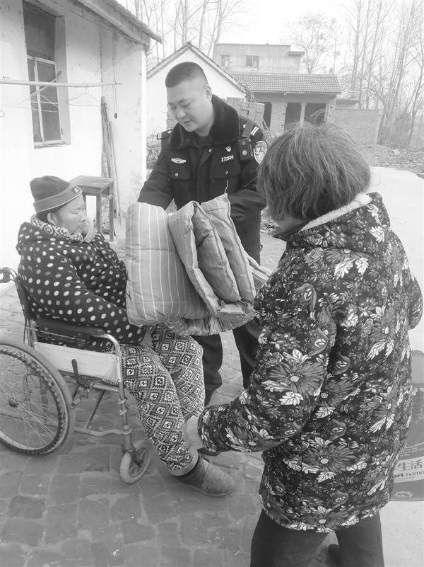 近日,沈丘县公安局民警崔伟进驻留福镇新寨行政村开展扶贫工作时,发现困难群众范进报家中被褥单薄,生活困难。范进报由于脑出血后遗症导致生活不能自理,妻子刘彩琴身患癌症,无劳动能力,儿子儿媳常年外出务工。崔伟自掏腰包为范进报一家购买了棉衣棉被等生活用品,并帮助他们把屋里屋外打扫干净,迎接新春佳节到来。 黄海涛 摄