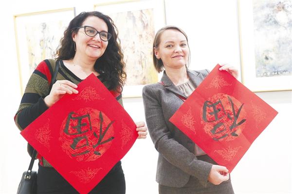 ④1月17日,观众在比利时布鲁塞尔中国文化中心展示自己获赠的书法作品。