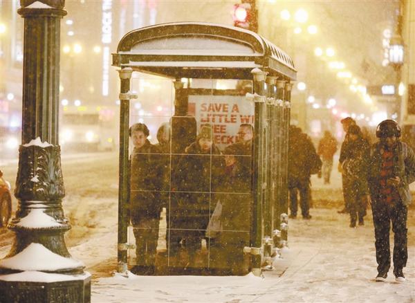 ⑤1月17日,在美国芝加哥,人们在雪中等待公共汽车。