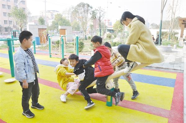 去年以来,商水县新建街头游园32个、边角绿地56处,新增绿地31万平方米,城市生态环境建设取得新进展。图为小朋友在街头游园玩耍。
