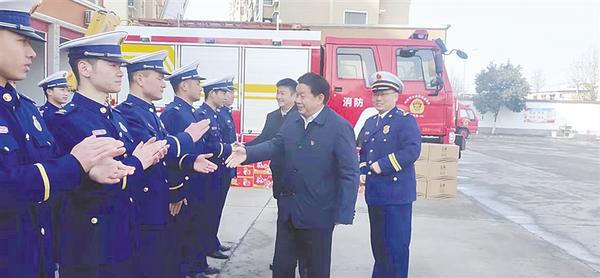 本报讯 (记者 韩志刚 文/图) 1月19日上午,区委书记李宗喜带领区四个班子成员先后到周口军分区、区消防大队、区人武部等地,看望慰问驻周部队广大官兵,为他们送去慰问品和节日的问候。区领导李湛、梁显学、张剑锋、时文祥、吕振龙、高新传、王建党参加慰问。